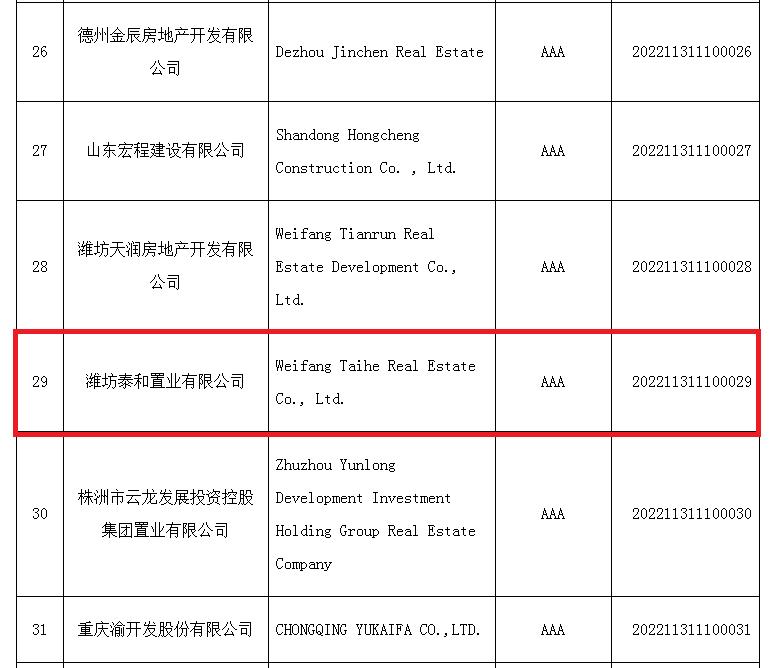 2022年12月27日,中國房地產(chǎn)業(yè)協(xié)會公布了2022年全國房地產(chǎn)開發(fā)企業(yè)信用評價等級結(jié)果,全國43家房地產(chǎn)開發(fā)企業(yè)經(jīng)嚴格、公正評審后獲評信用等級。集團泰和置業(yè)榮獲此次信用評價的最高等級——AAA級,這也是泰和置業(yè)繼2016年、2019年獲評AAA級后,再次獲得國家權(quán)威機構(gòu)的肯定。