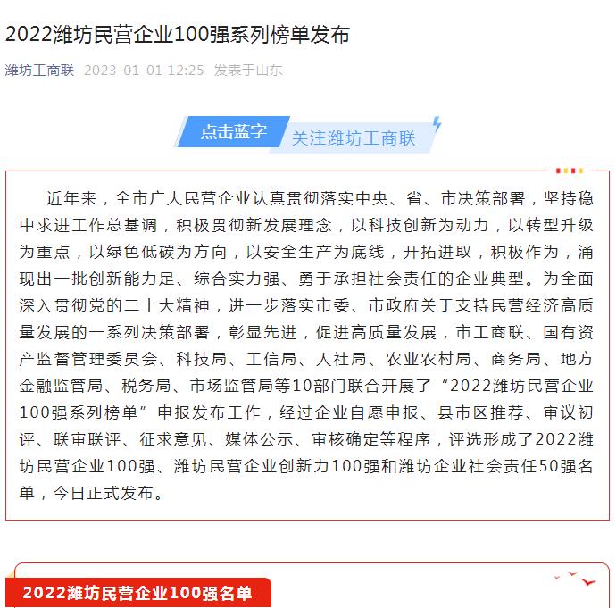 2023年1月1日,濰坊工商聯(lián)發(fā)布了2022濰坊民營企業(yè)100強(qiáng)系列榜單,濰坊泰和置業(yè)有限公司同時斬獲“濰坊民企百強(qiáng)、社會責(zé)任50強(qiáng)”兩項榮譽(yù)。