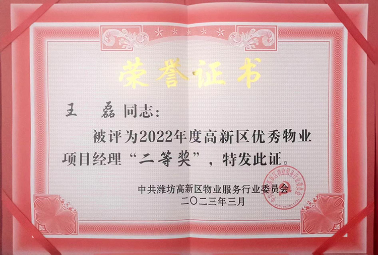 4. 泰和東郡項(xiàng)目經(jīng)理王磊獲“2022年度高新區(qū)優(yōu)秀物業(yè)項(xiàng)目經(jīng)理二等獎(jiǎng)”