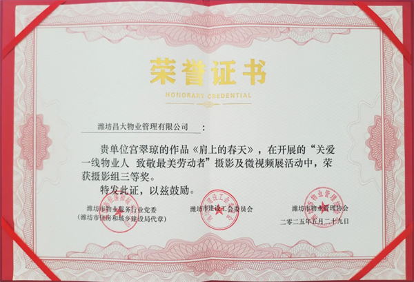 2025年5月30日,在全市物業(yè)行業(yè)“關(guān)愛(ài)一線物業(yè)人 致敬最美勞動(dòng)者”攝影及微視頻展活動(dòng)中,濰坊昌大物業(yè)管理有限公司提報(bào)的兩部作品雙雙獲獎(jiǎng)!《肩上的春天》榮獲三等獎(jiǎng),《平凡微光·匠心守護(hù)》榮獲優(yōu)秀獎(jiǎng),這份雙重榮譽(yù),是對(duì)昌大物業(yè)企業(yè)文化的生動(dòng)詮釋?zhuān)菍?duì)全體物業(yè)人敬業(yè)精神的崇高禮贊!