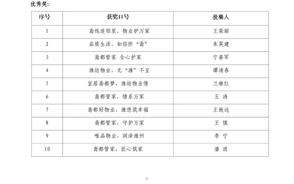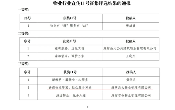 2025年7月11日,全市物業(yè)行業(yè)宣傳口號(hào)征集評(píng)選結(jié)果正式揭曉,昌大物業(yè)憑借“鳶都物業(yè)管家,貼心服務(wù)萬(wàn)家”的響亮口號(hào),從全國(guó)各地800余條投稿中脫穎而出,榮獲三等獎(jiǎng)!這一口號(hào)充分展現(xiàn)了昌大物業(yè)扎根濰坊、服務(wù)萬(wàn)家的責(zé)任擔(dān)當(dāng),同時(shí)展現(xiàn)了昌大物業(yè)“讓生活更美好”的堅(jiān)定服務(wù)承諾。