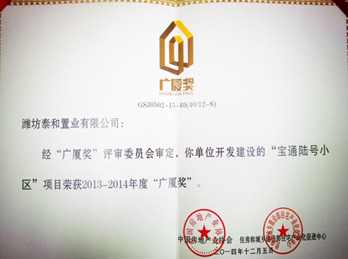? ? ? ?2014年12月5日,國務院批準設立的國家級房地產業(yè)綜合性大獎——國家“廣廈獎”頒獎典禮在北京隆重舉行。濰坊泰和置業(yè)有限公司開發(fā)的“寶通陸號”小區(qū),在眾多參評項目中脫穎而出,榮膺此項殊榮。這是房地產行業(yè)內最權威和房地產項目的最高榮譽。集團此項榮譽的獲得也填補了濰坊中心城區(qū)在獎項上的歷史空白,實現(xiàn)了零的突破。