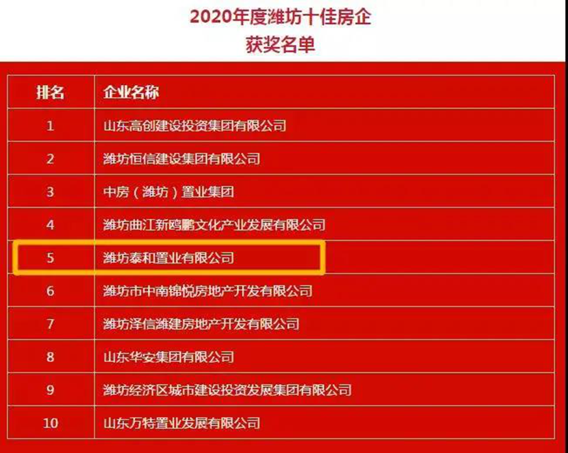 在由山東省互聯(lián)網傳媒集團-大眾網濰坊發(fā)起的“聚實力,開新局”2020年濰坊地產行業(yè)評選活動中,泰和置業(yè)憑借超高的人氣和社會影響力,在全市房地產企業(yè)中,以排名前十的成績獲評“2020年度濰坊十佳房企”獎。